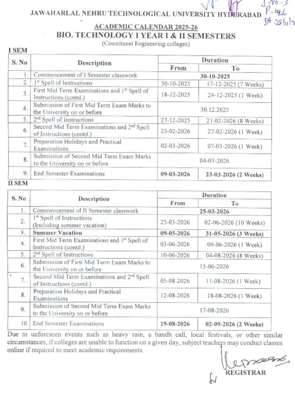 Revised B.Tech I Year I & II Sem Academic Calender 2025-26
