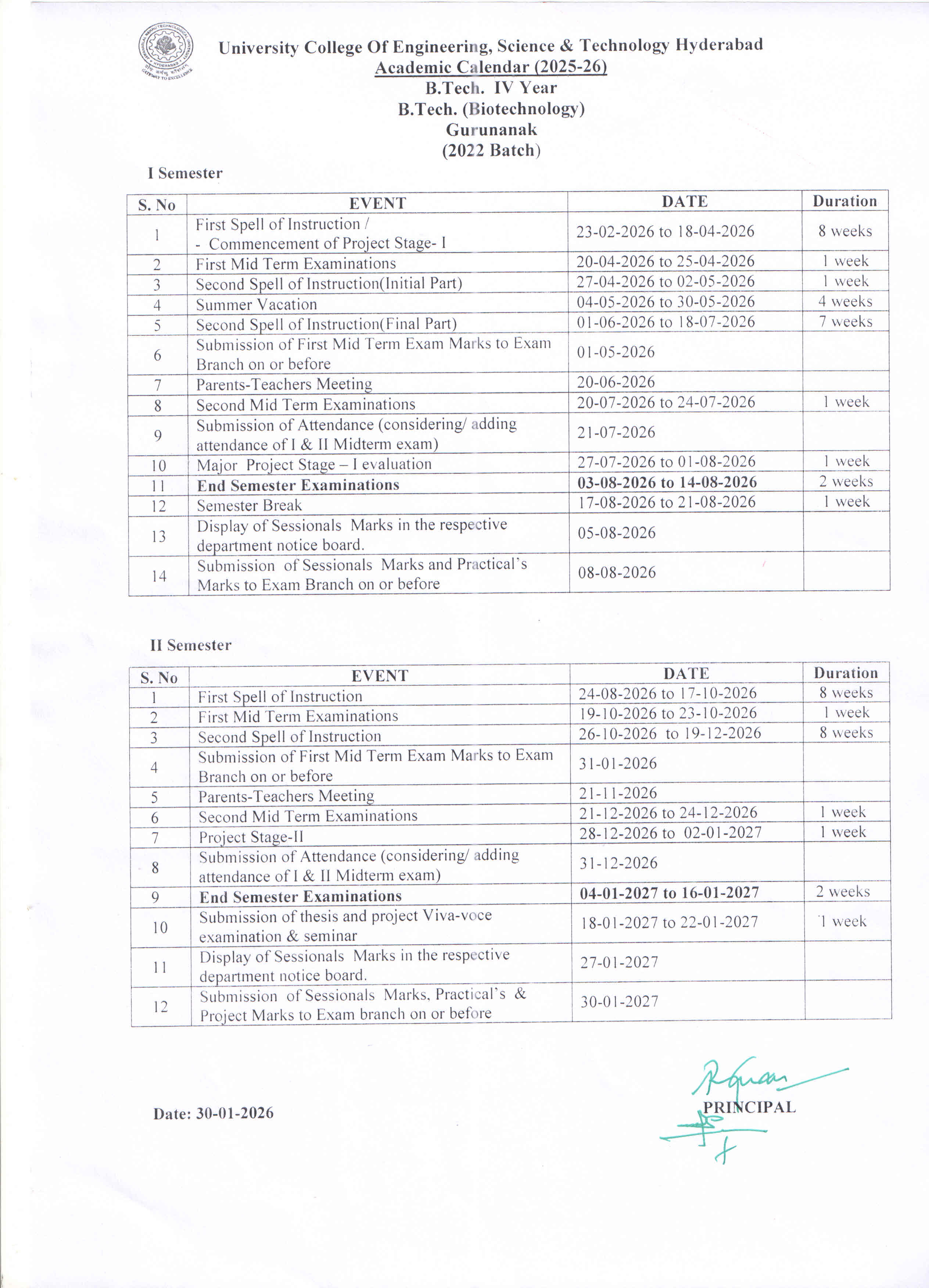 B.Tech (Biotech) Gurunanak IV Year Academic Calendar (2025-26)