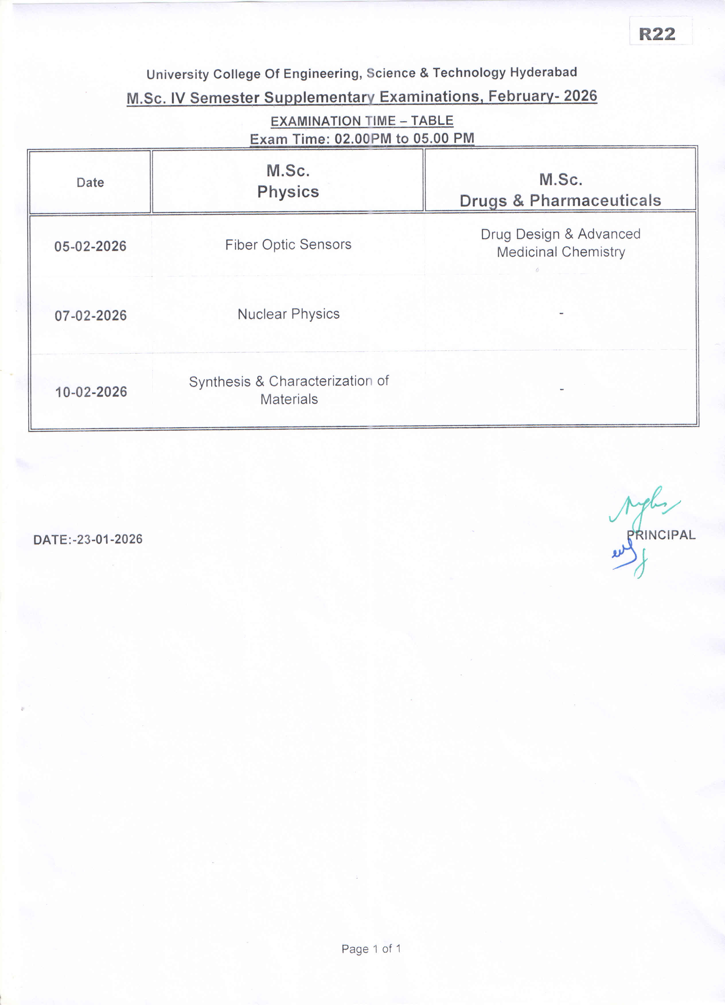 Revised Time Table for M.Sc. IV Semester Regular / Supplementary Examinations (R22) , August- 2025