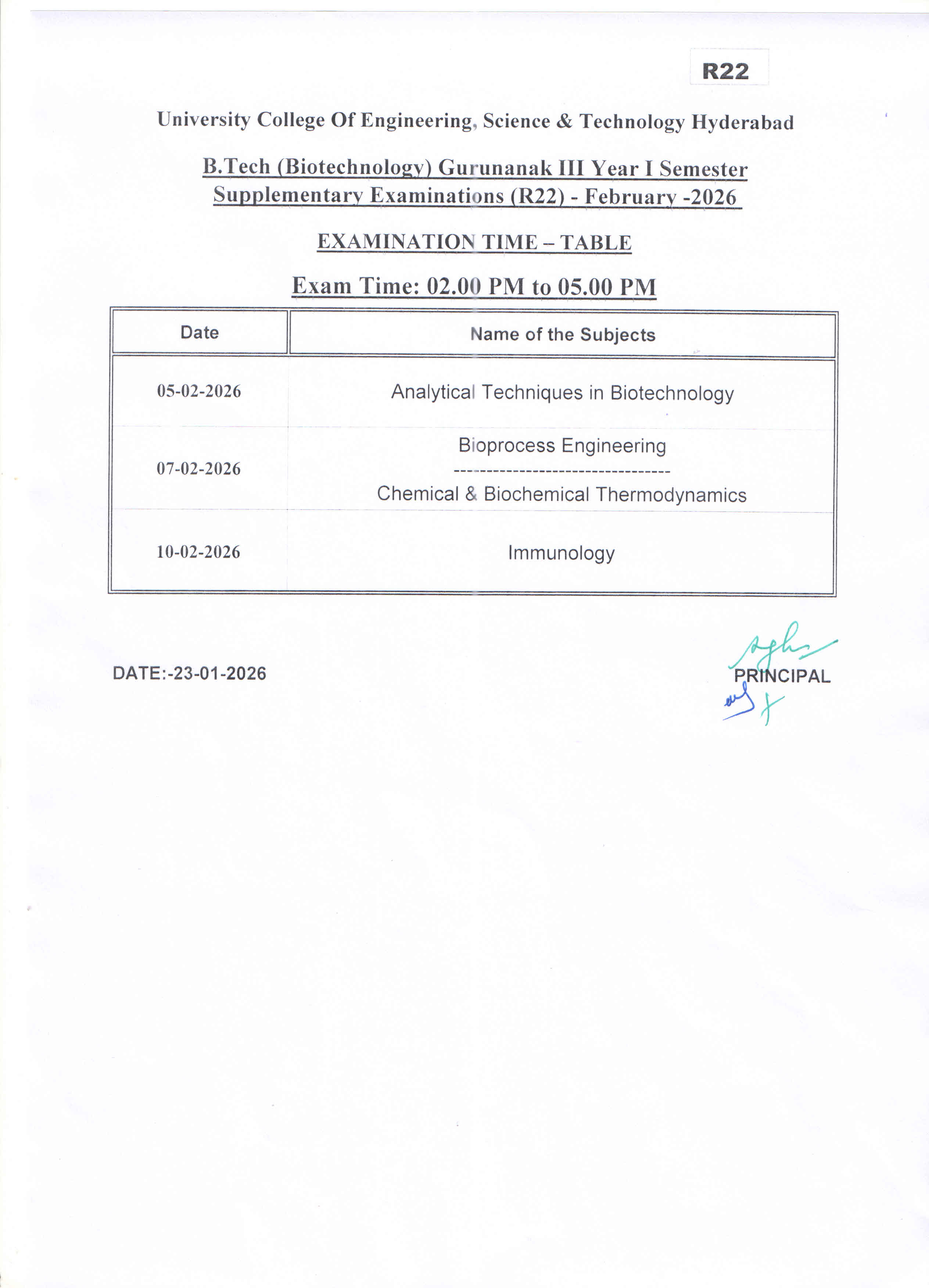 Circular for B.Tech (Biotechnology) (Gurunanak) III Year I Semester Regular Examinations , September - 2025 , are postponed and rescheduled dates.