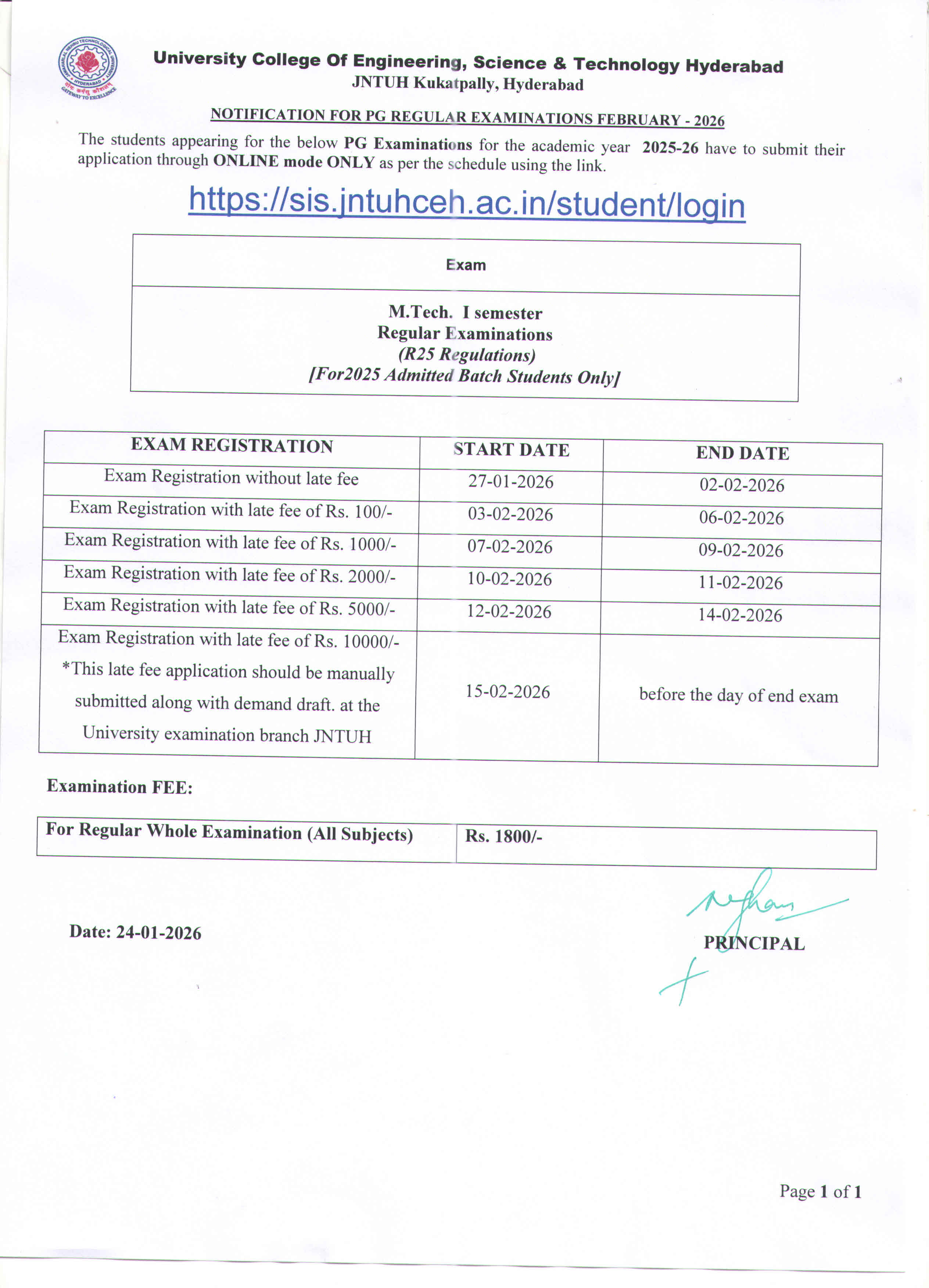 Notification for M.Tech I Year I Semester Regular Examinations (R25),February 2026.